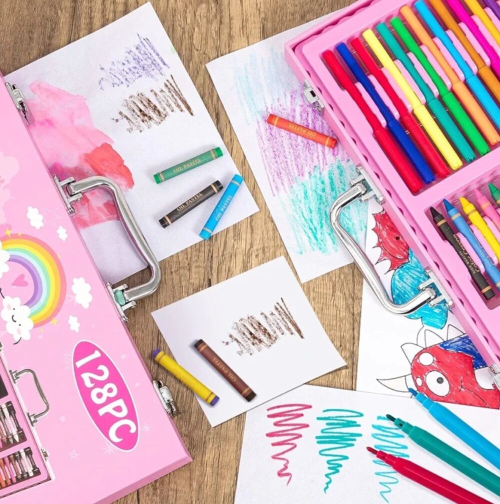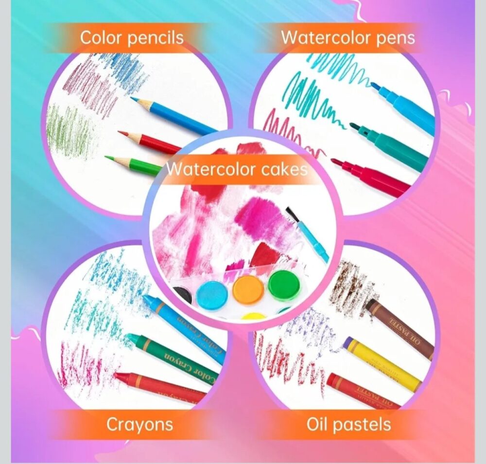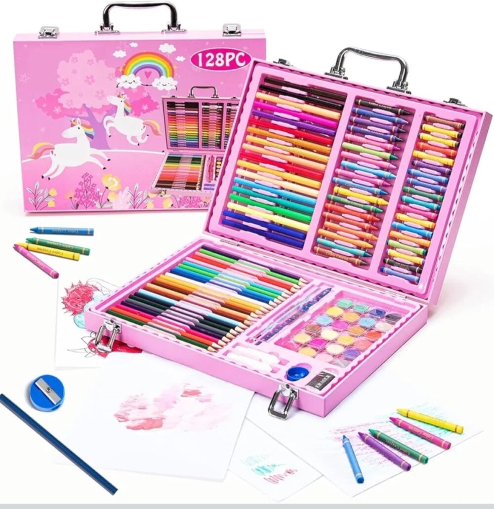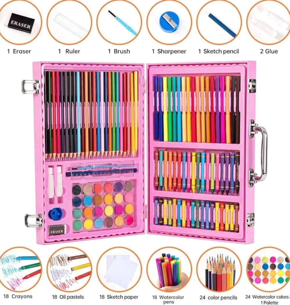 • 128 PCS Complete Art Set – all essentials in one boxIncludes crayons, oil pastels, watercolor pens & color pencils
