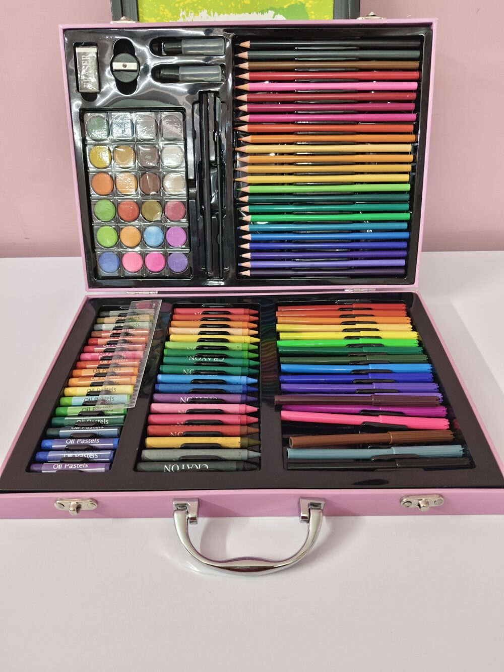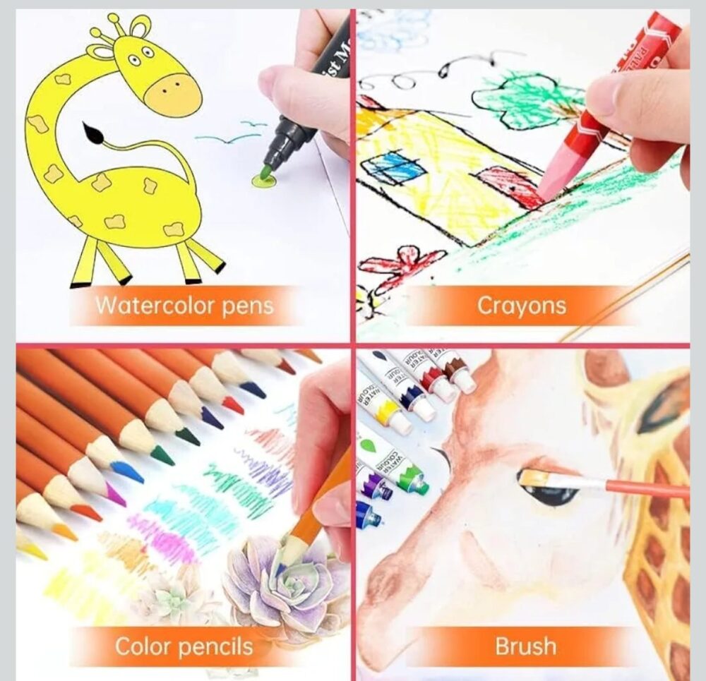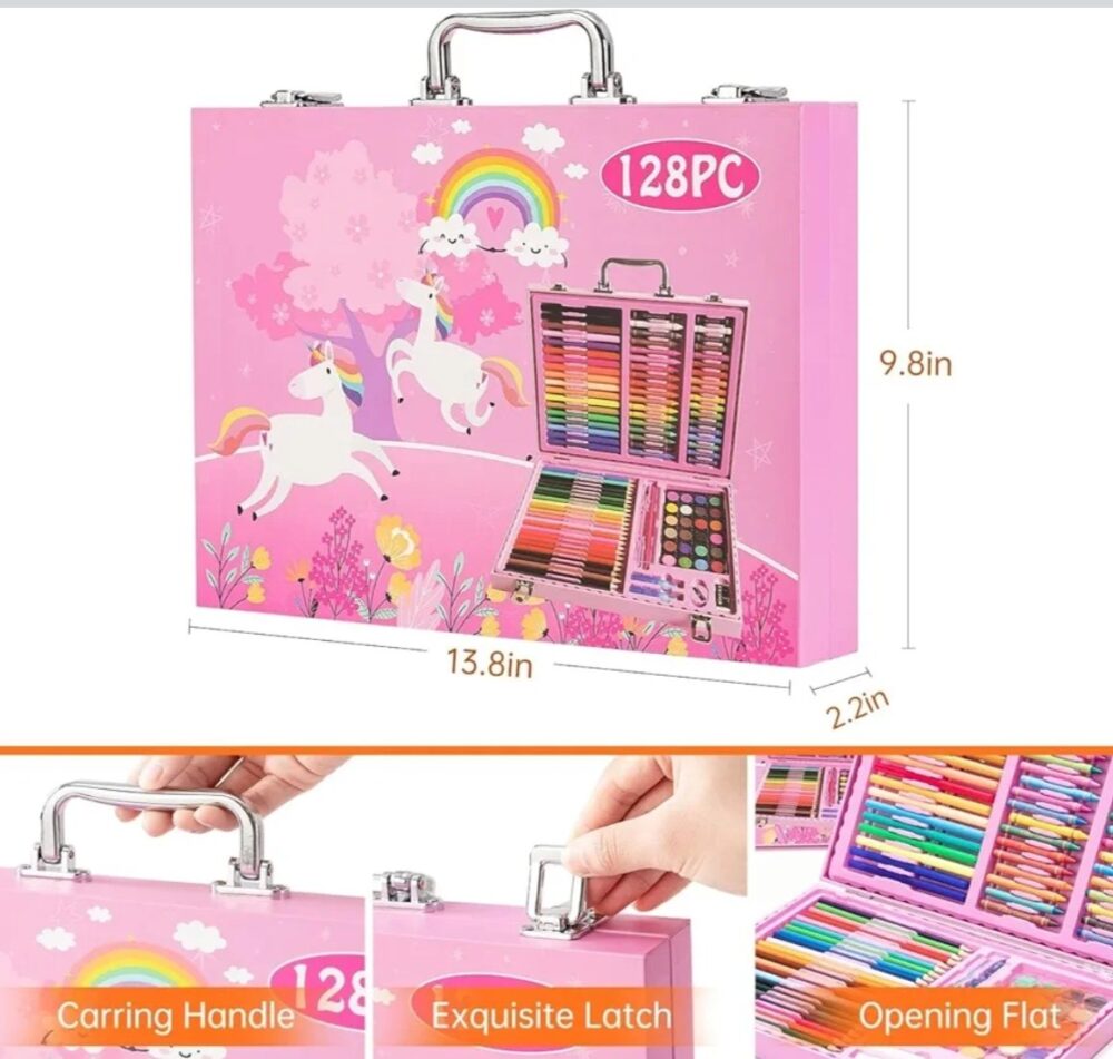 • 128 PCS Complete Art Set – all essentials in one boxIncludes crayons, oil pastels, watercolor pens & color pencils