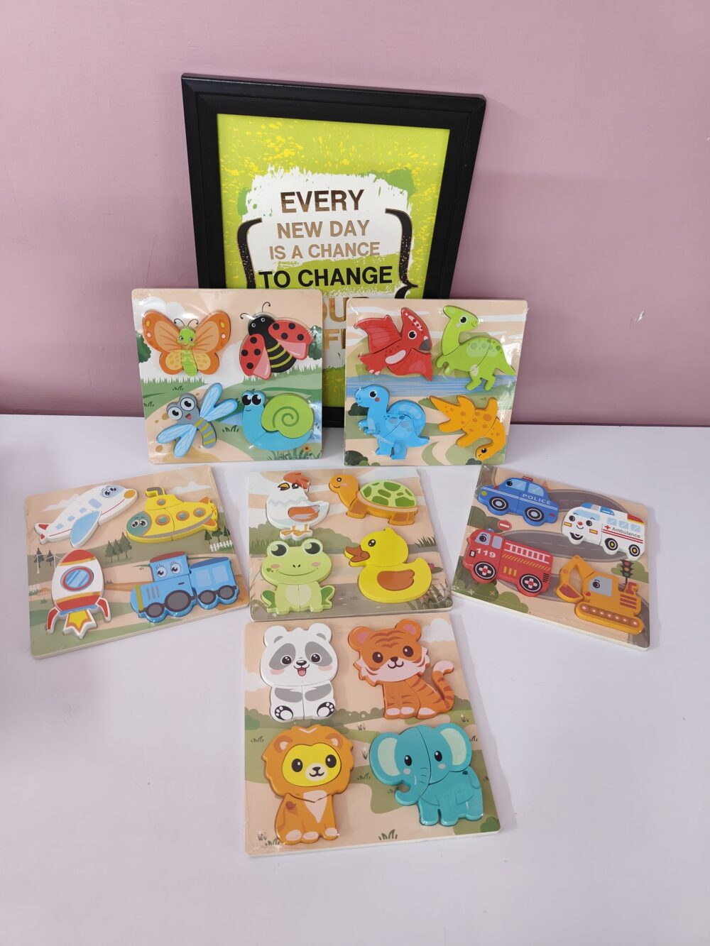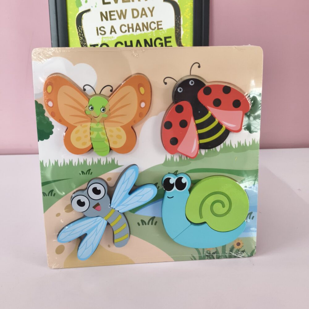 - Colourful 4 piece wooden chunky puzzles – perfect for little handsEach board features cute themes – animals, insects, dinosaurs, vehicles & more