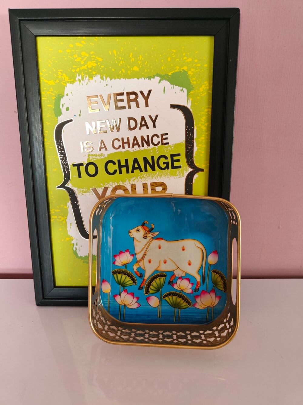 • Vibrant Designs: Features elegant lotus and cow motifs inspired by traditional Indian art.Premium Finish: Made with high-quality metal and a coating for long-lasting shine.
