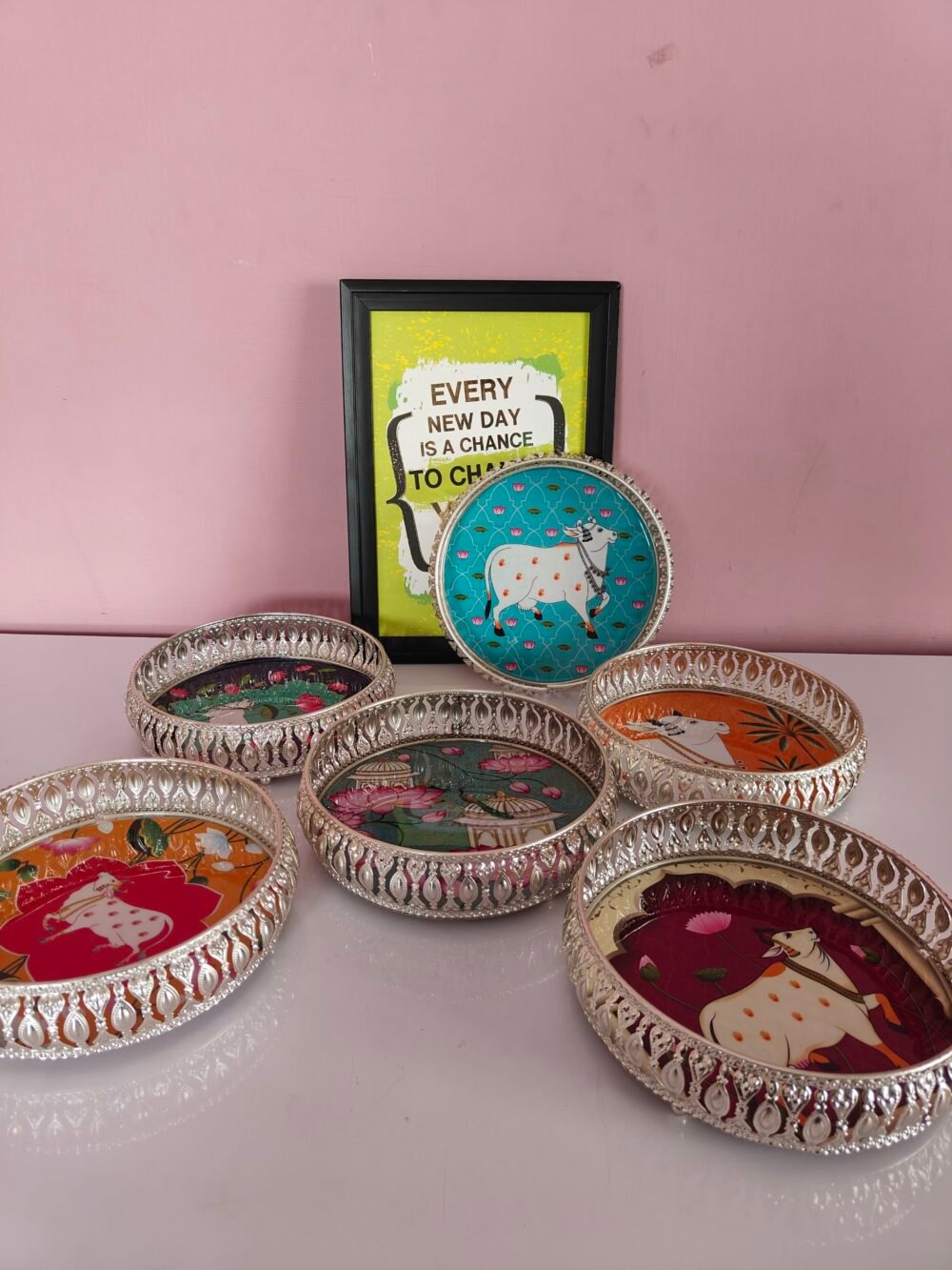 Enhance your home décor with this exquisite Pichwai German Silver Tray, beautifully crafted with traditional artwork inspired by sacred cows, lotus motifs, and divine themes. The intricate Pichwai designs are framed in an elegant German silver border, making it a perfect blend of spirituality and sophistication.