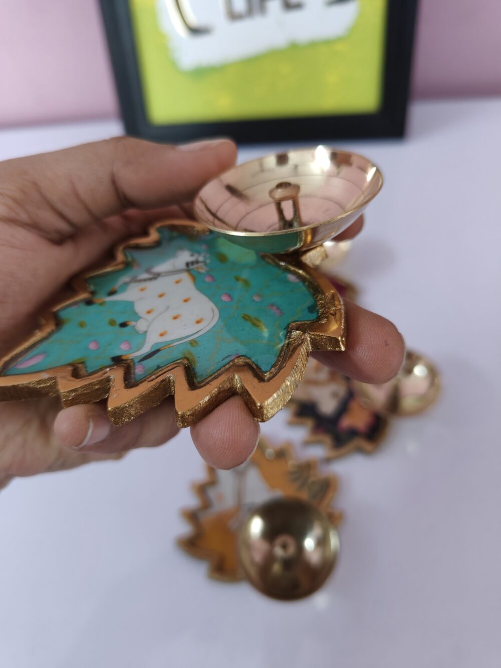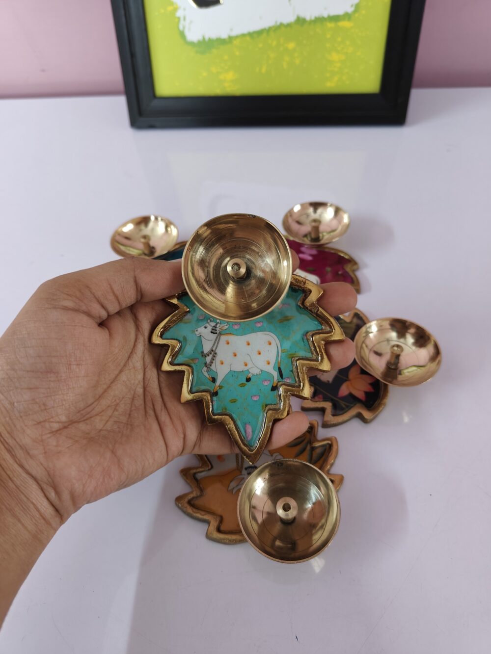 - Handcrafted – Designed in leaf shape with intricate Pichwai-style cow paintings.