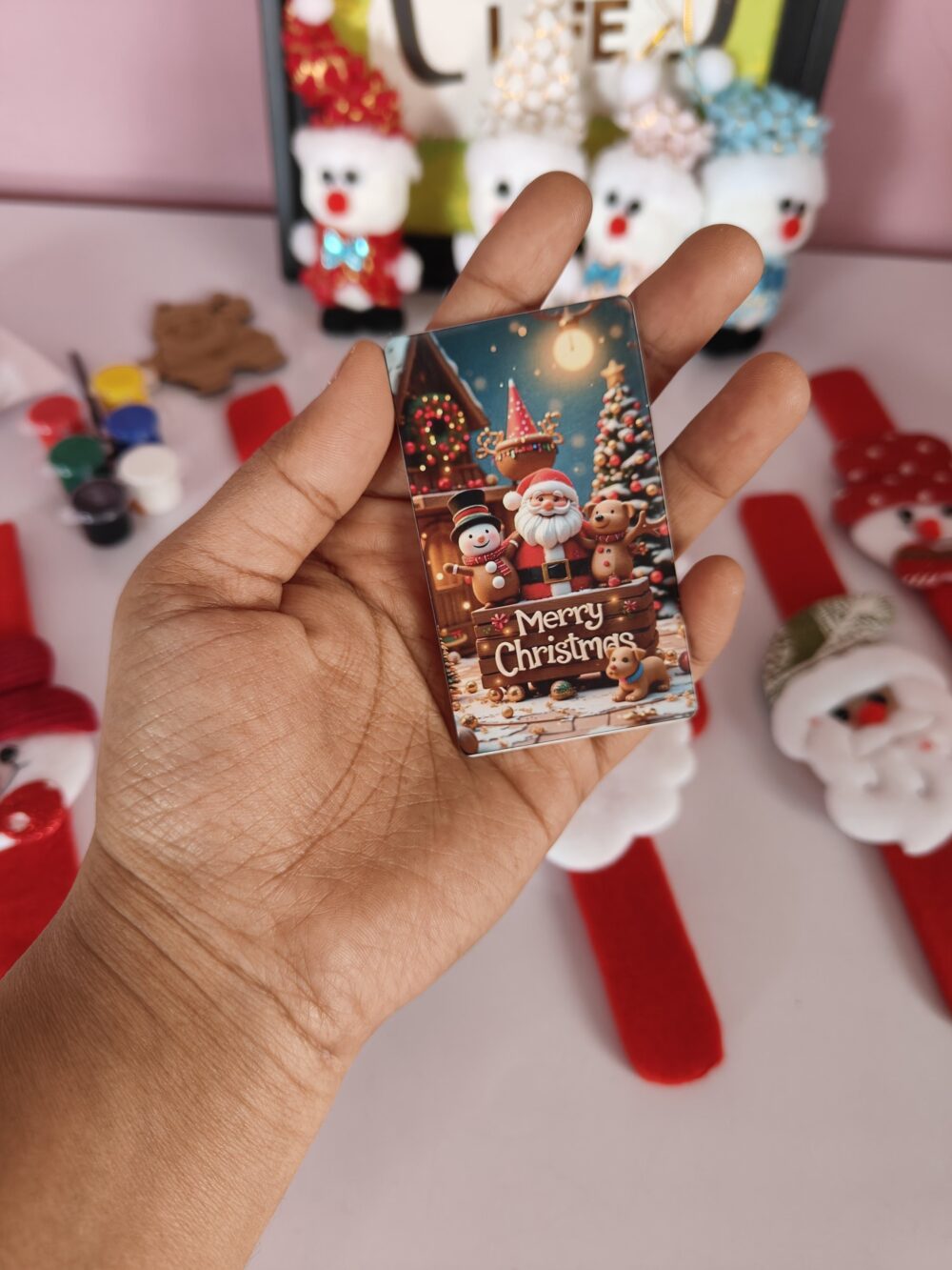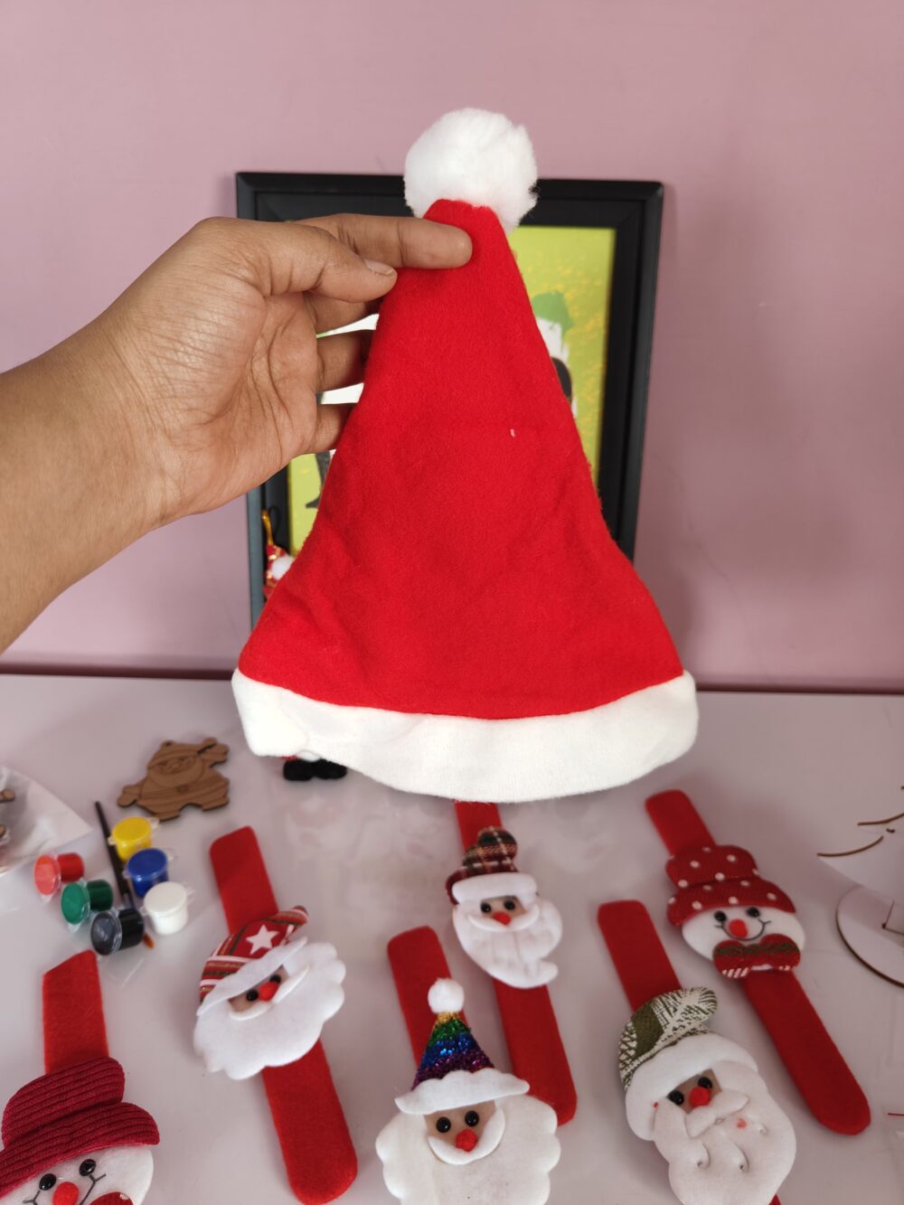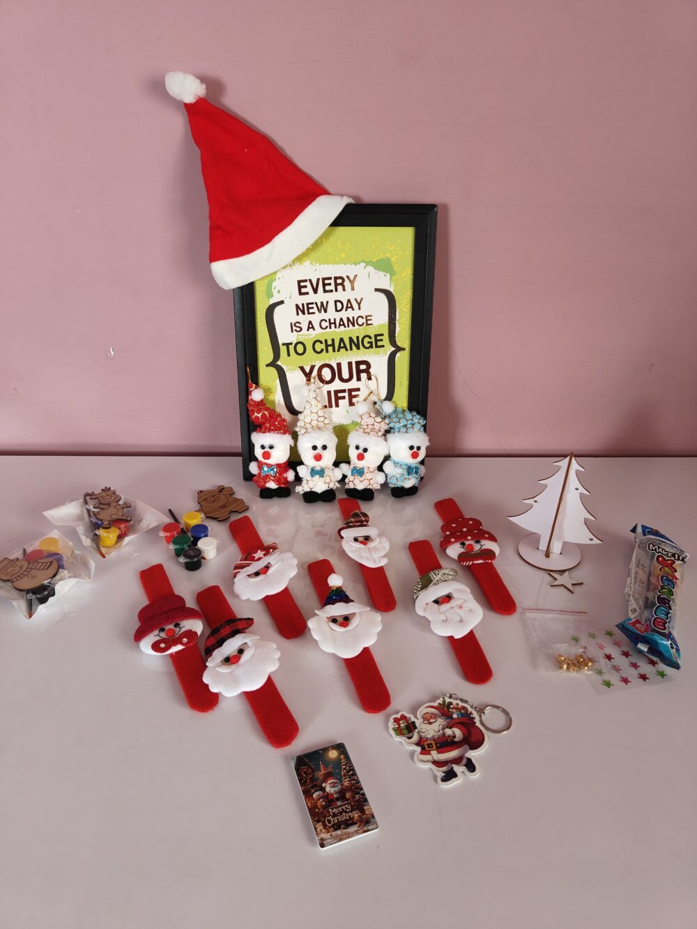 - Includes Santa slap bands, mini figurines, keychain, wooden ornaments & décor pieces