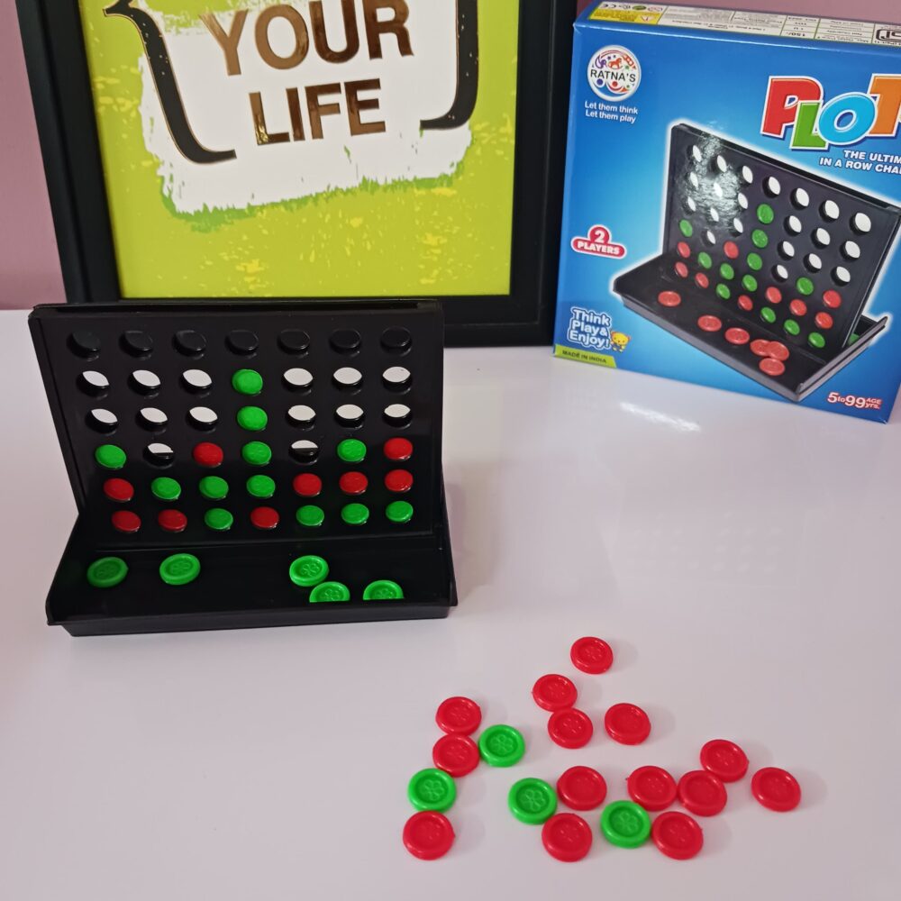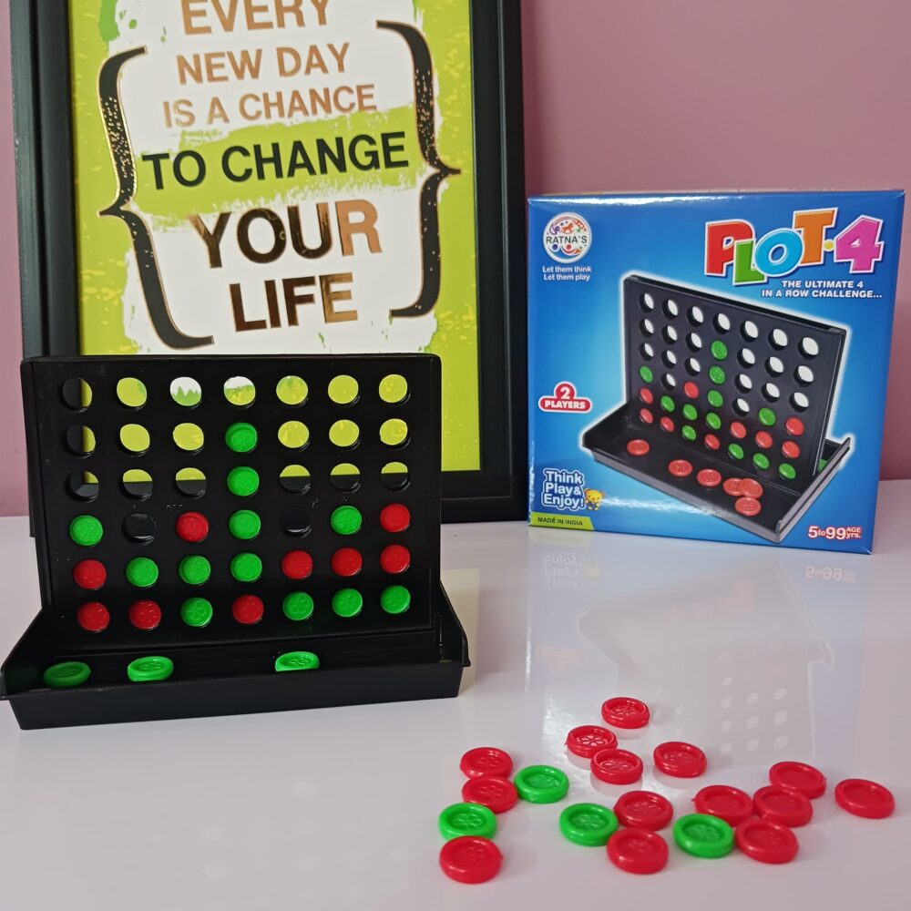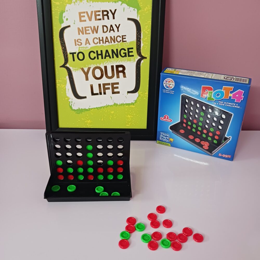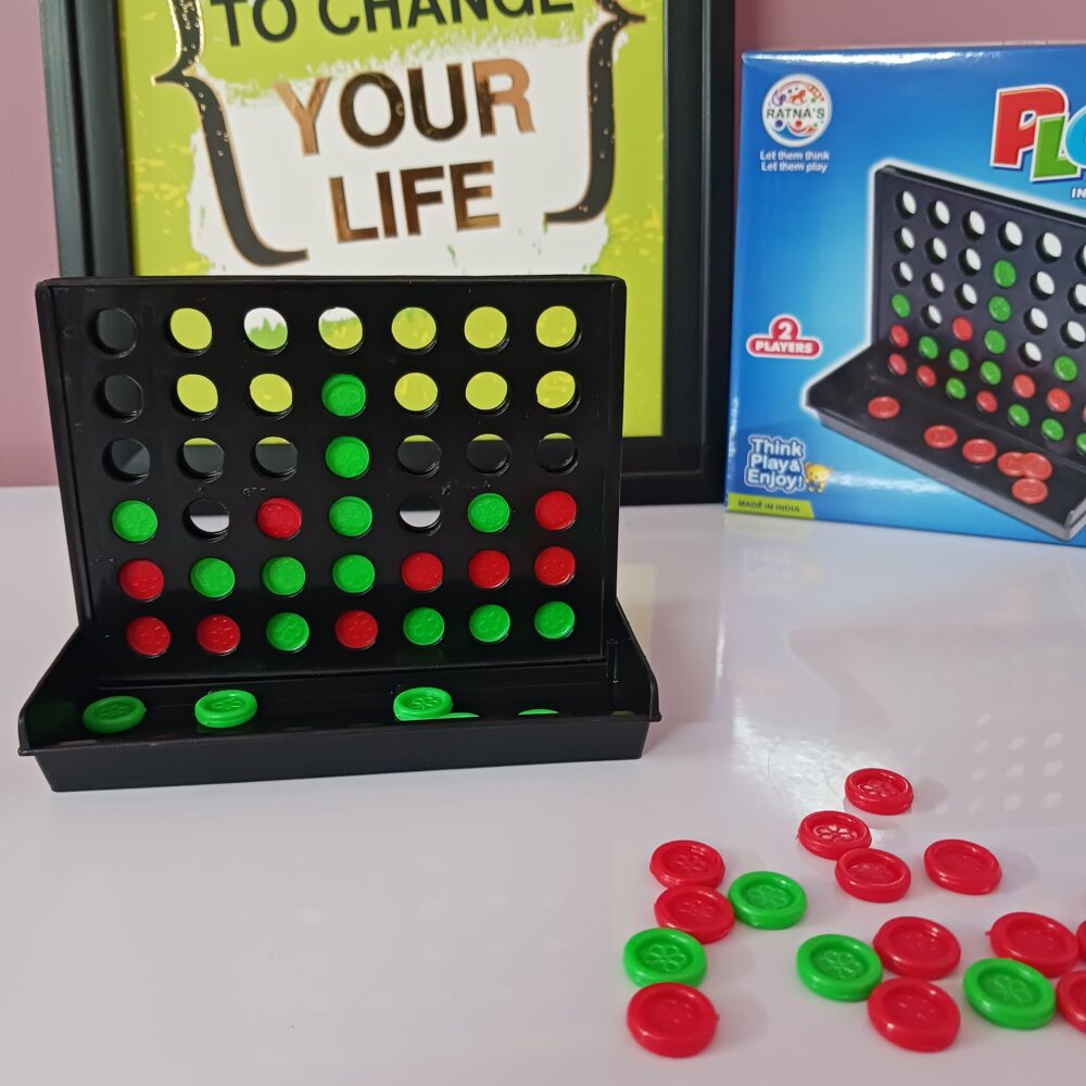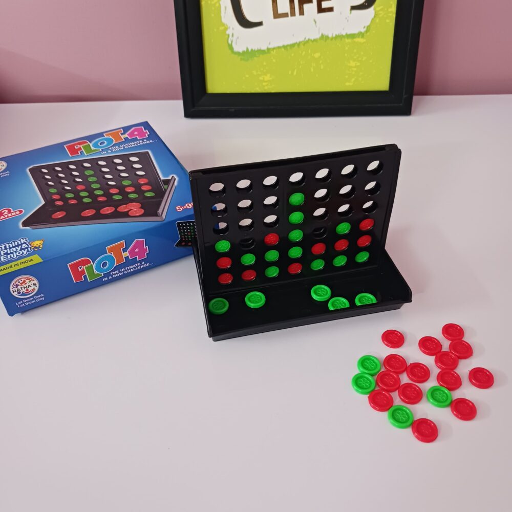 • Classic 2-player strategy game – connect 4 discs in a row to win!Includes sturdy grid, 21 red discs & 21 green discs.