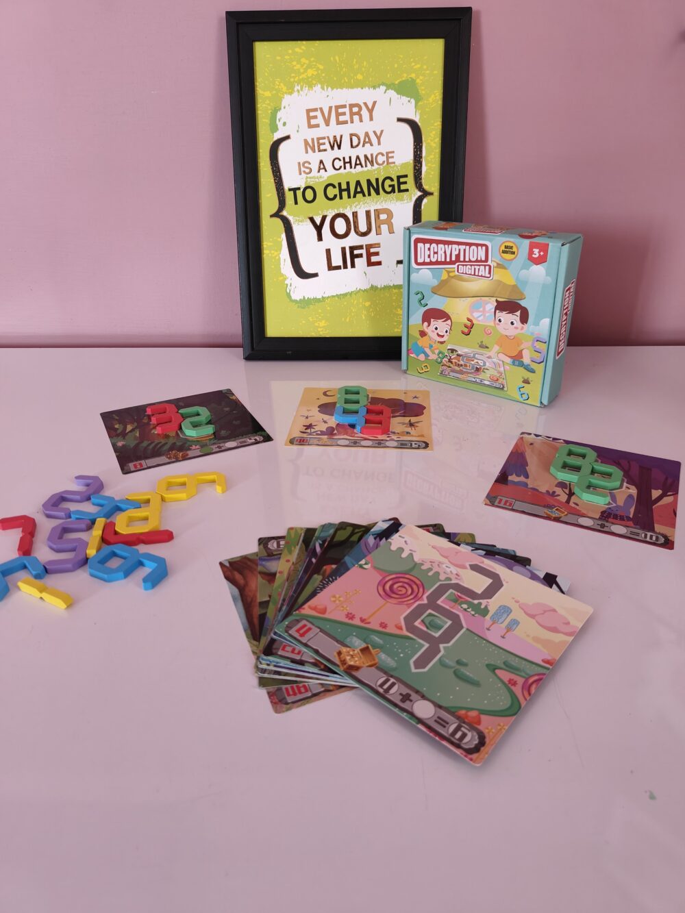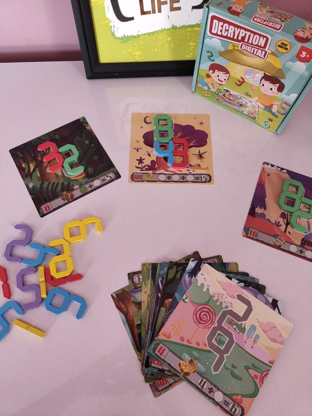 - Fun Learning Through Play – Boosts logic and number recognition with colorful visual puzzles.Innovative Decryption Game – Kids use shaped pieces to solve number-based clues on themed cards.