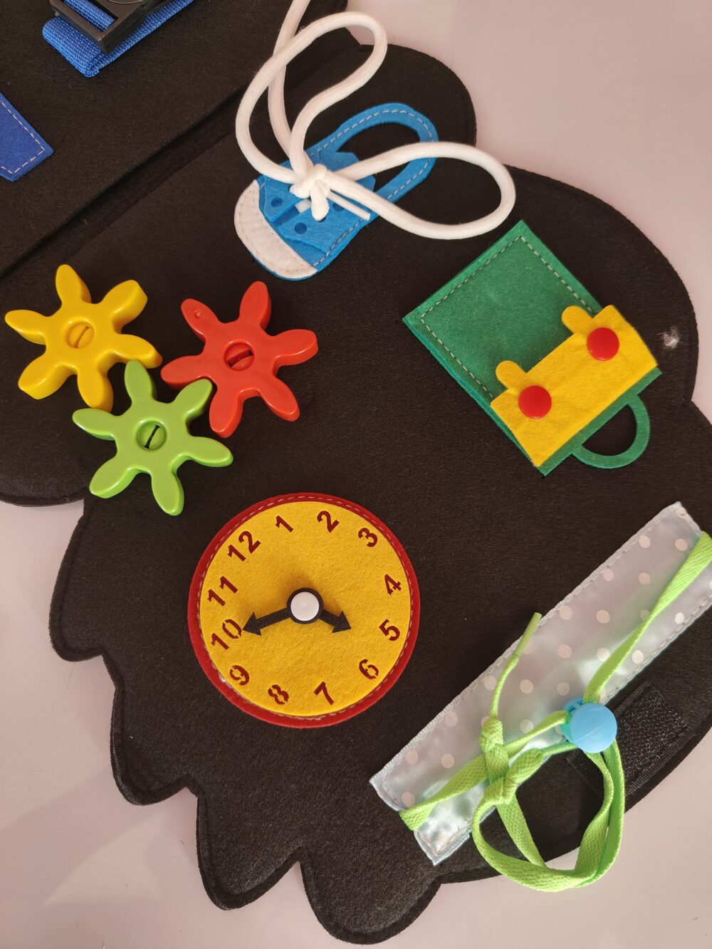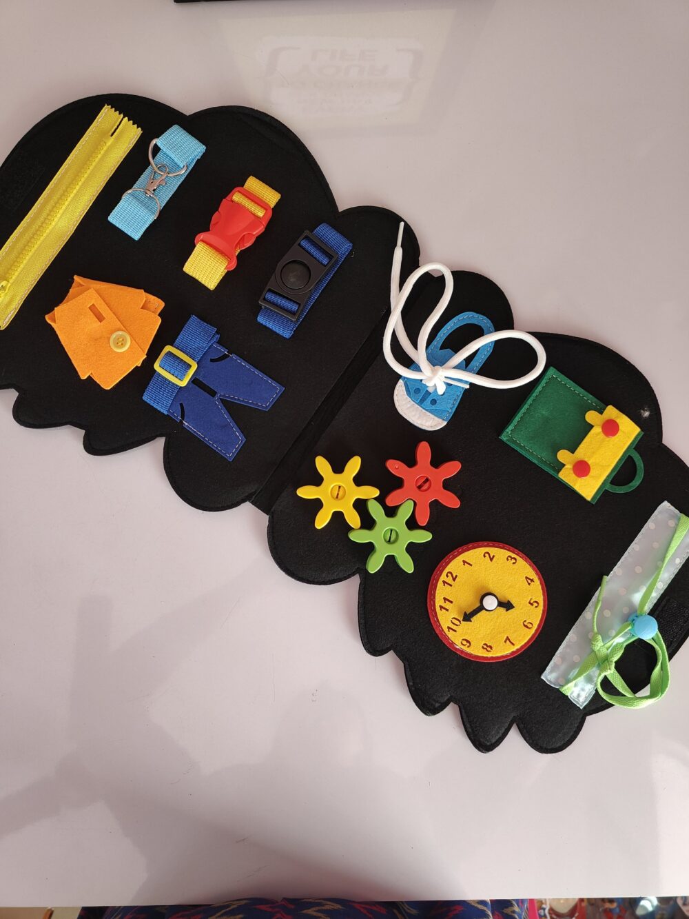 - Adorable dinosaur-shaped busy book