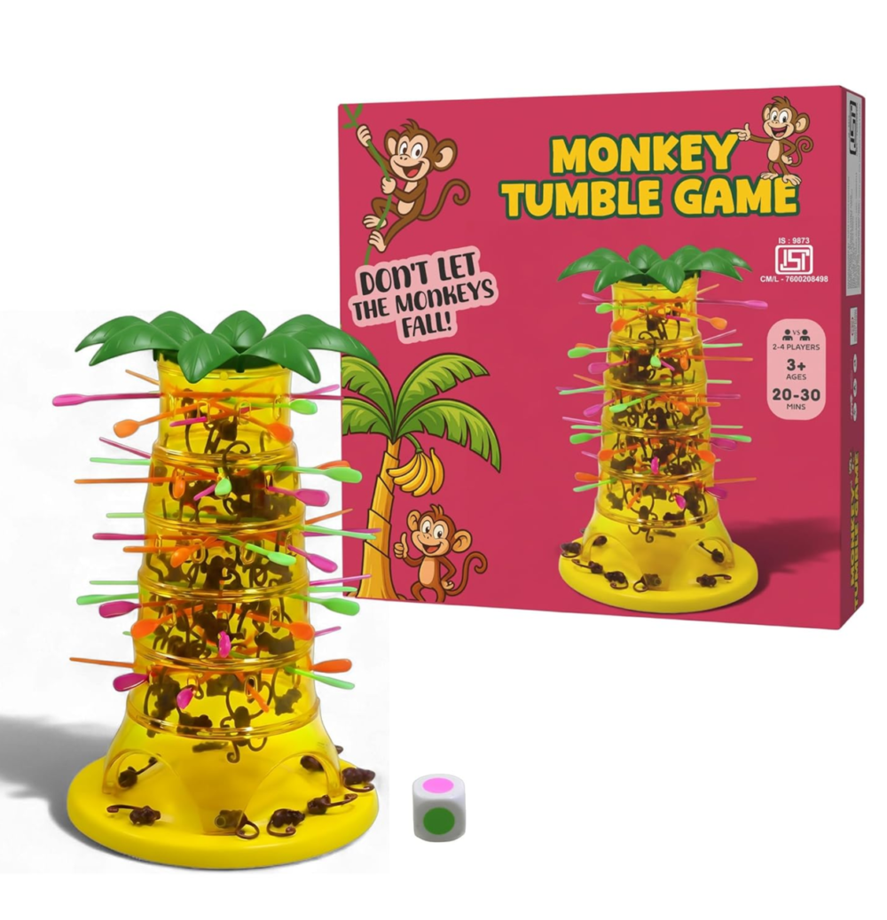 The Monkey Tumble Game is an easy-to-learn and fun skill-based game for 2-4 players. The objective is to remove colored sticks from the tree tower without letting the monkeys fall down.
