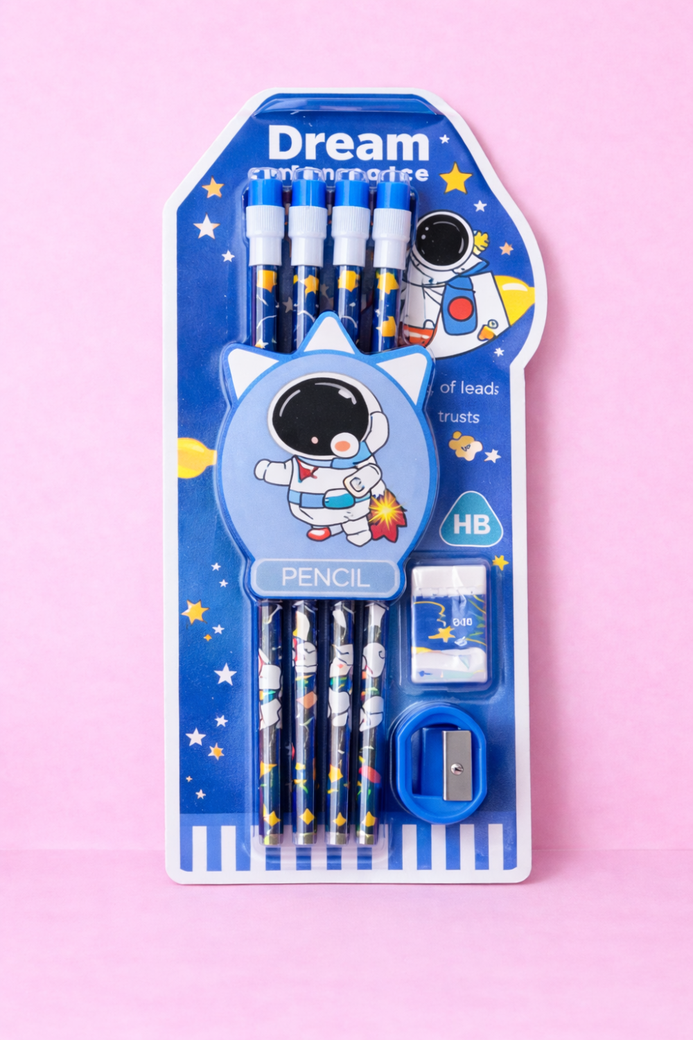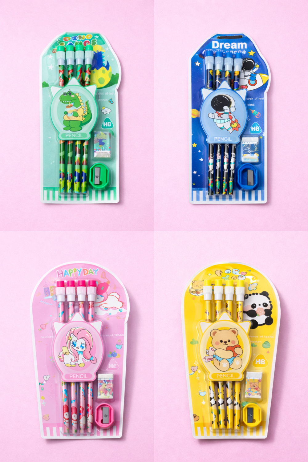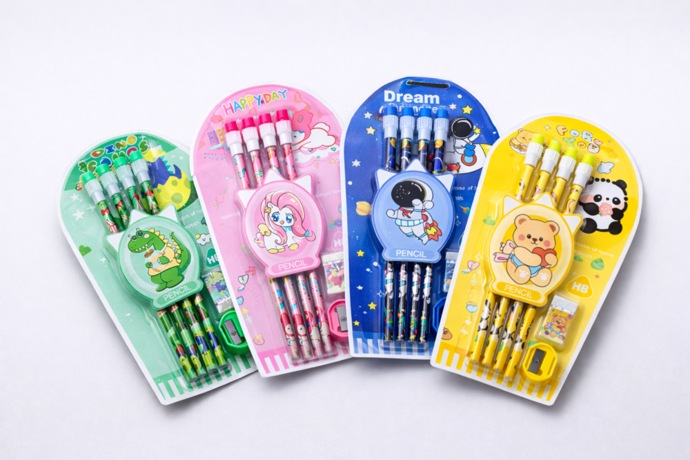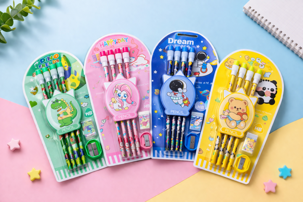 - All-in-One Stationery Set – Includes 4 HB pencils, 1 sharpener and 1 eraser in one compact pack