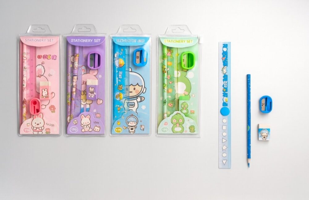 - 5-in-1 Set – Includes 1 pencil, 1 ruler, 1 eraser, 1 sharpener, and 1 zipped pouch