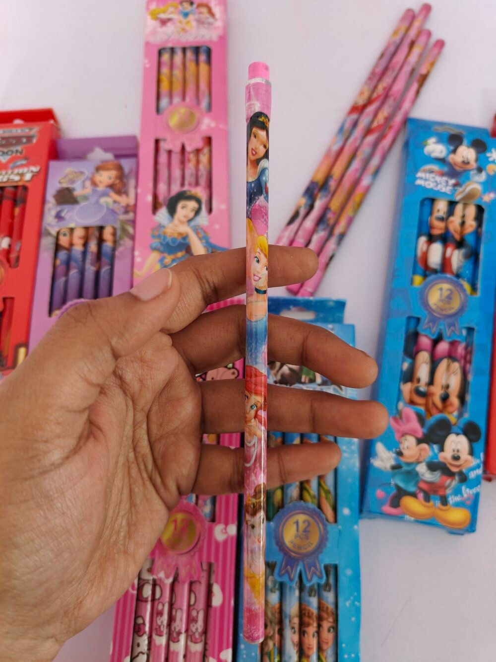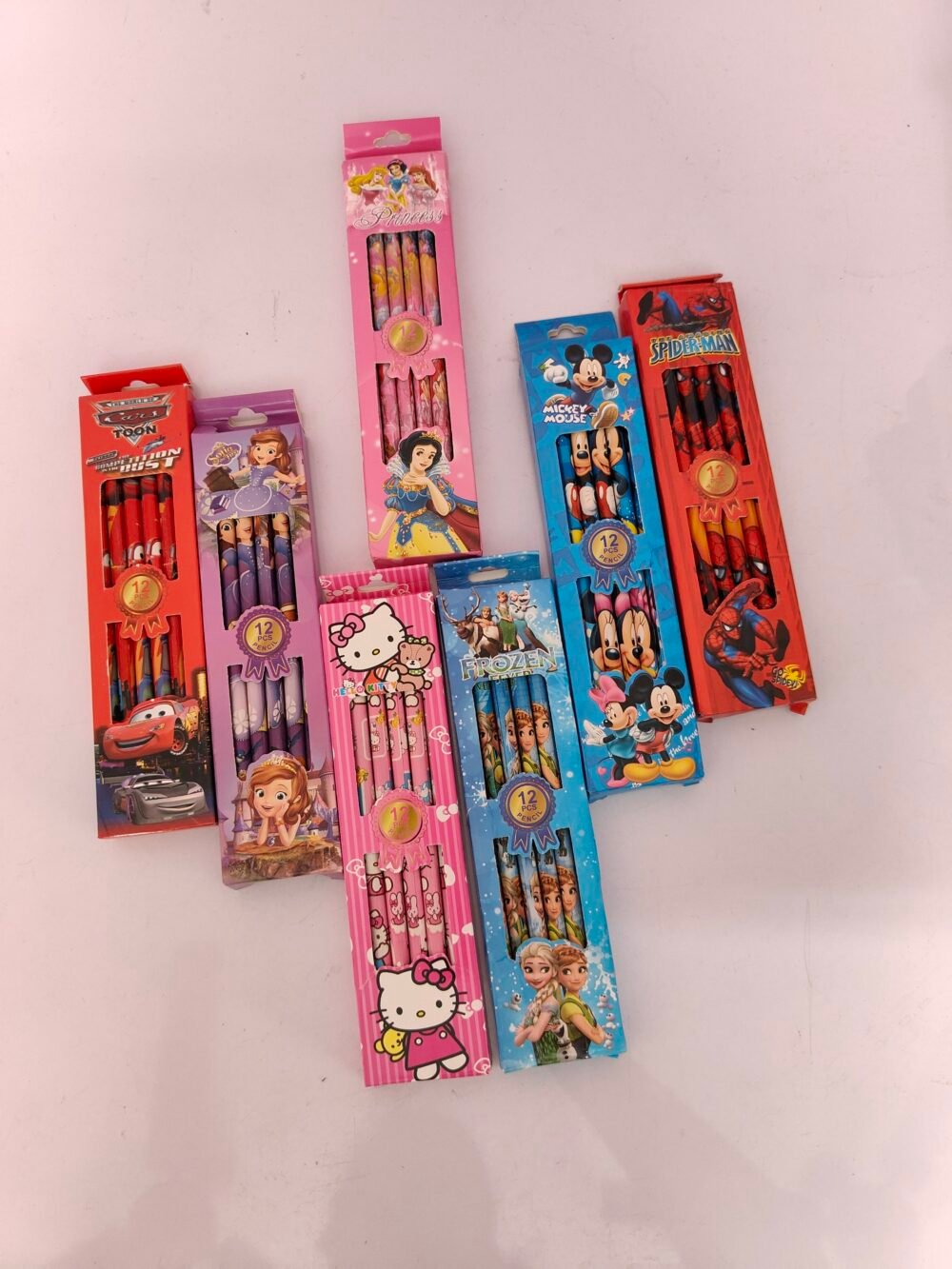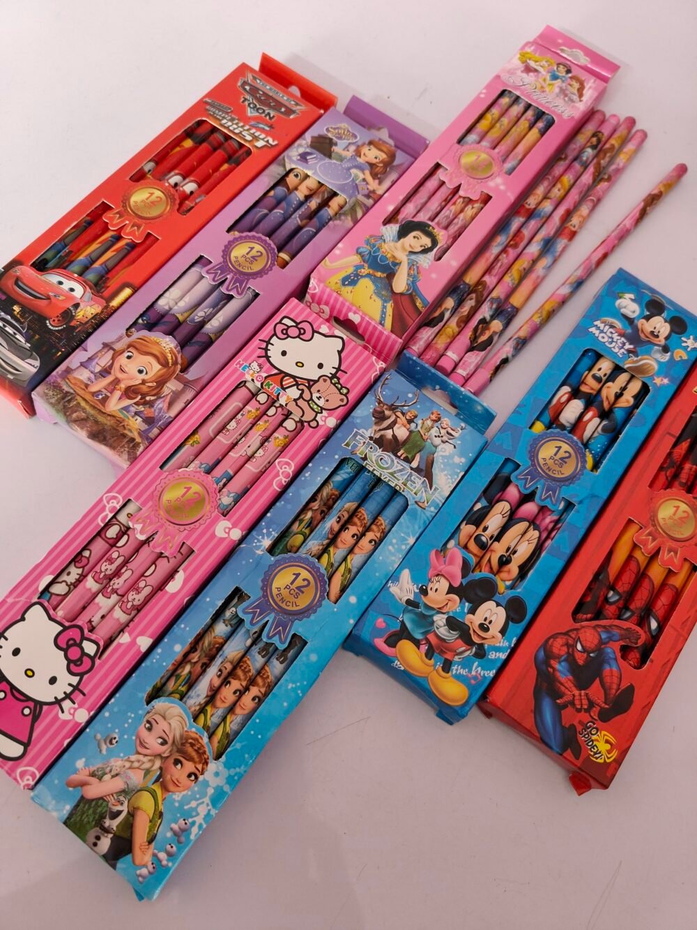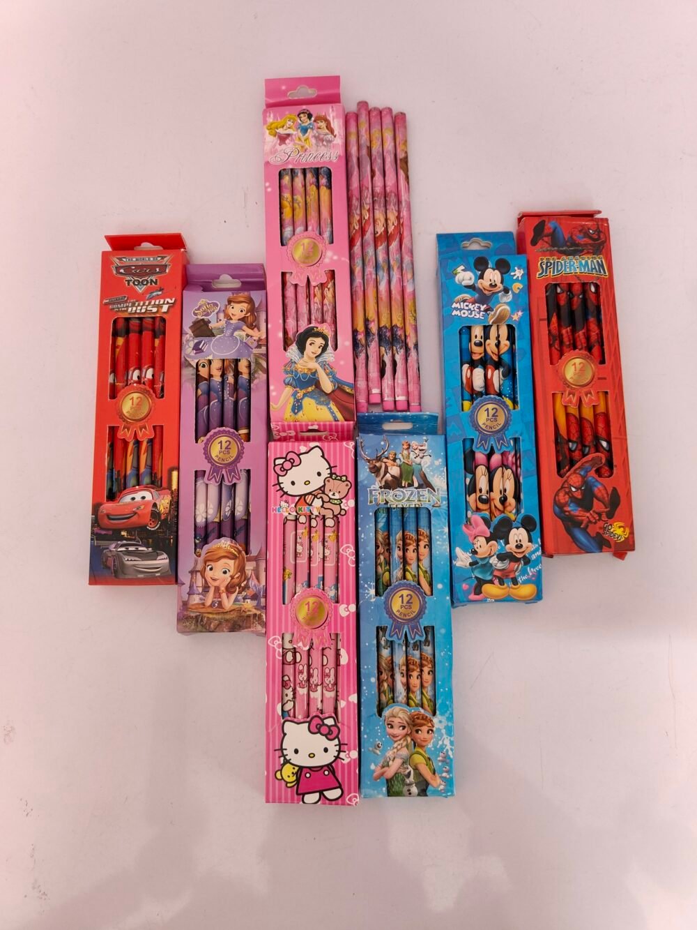 - Pencils in fun kids’ themesIncludes popular characters like Princess, Frozen, Hello Kitty, Mickey Mouse, Cars & Spider-Man